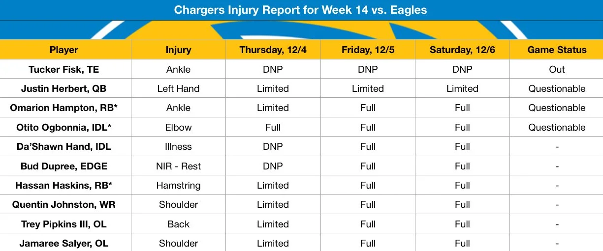 Justin Herbert, Omarion Hampton and Otito Ogbonnia are all officially questionable for Monday night’s game. The Chargers, including Herbert himself, have said all week that they expect the star quarterback to play in Week 14. It’s also worth noting that both Jordan Schultz and Jeremy Fowler of ESPN reported that Hampton will be activated from injured reserve and play against the Eagles.