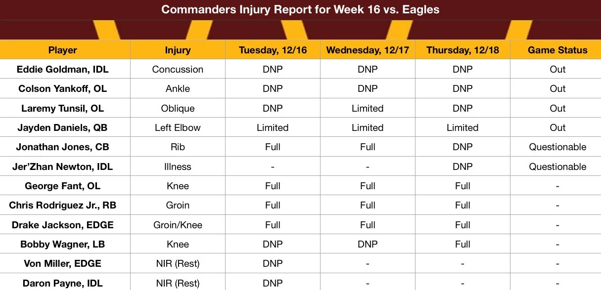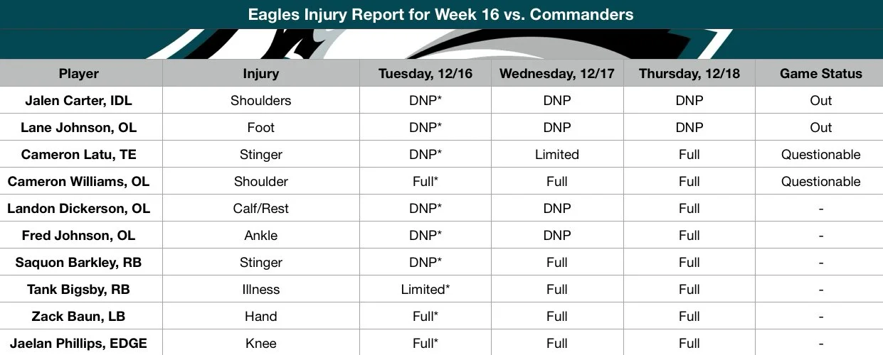 Eagles-Commanders Week 16 Injury Report: Who Is Playing in Washington?