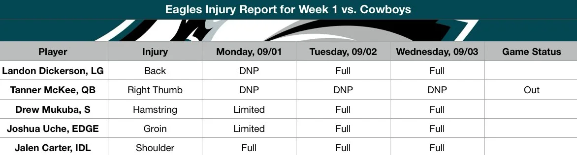 Here is the updated injury report for both the Eagles and the Cowboys ahead of their primetime matchup in Week 1.