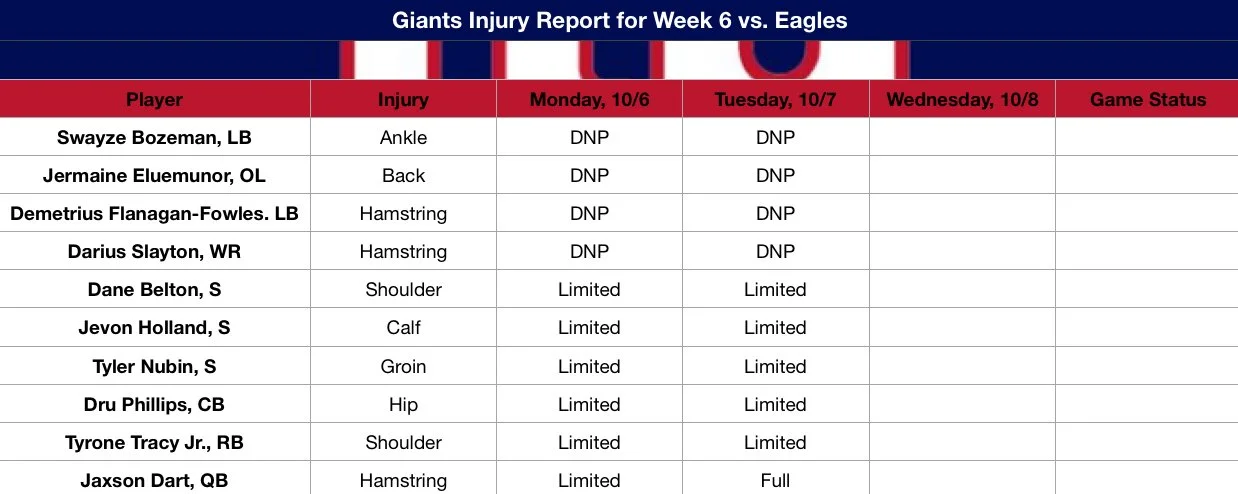 Swayze Bozeman, Jermaine Eluemunor, Demetrius Flanagan-Fowles and Darius Slayton were all projected as DNP once again. Giants head coach Brian Daboll seemed more positive about Eluemunor playing in Week 6 than Slayton playing.