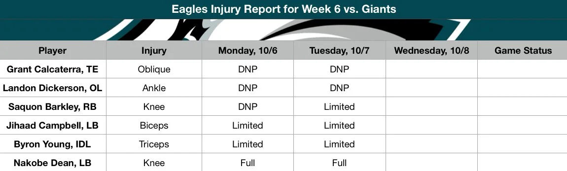 Saquon Barkley, Grant Calcaterra and Landon Dickerson were all estimated as DNP. Yet according to multiple reports, Barkley is dealing with general soreness and will be fine to play in Week 6.