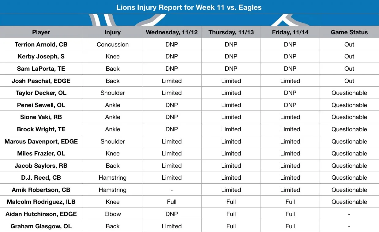 Seven players did not participate during Wednesday’s practice for the Lions. Terrion Arnold remains in concussion protocol and it’s uncertain if he’ll play on Sunday night. Aidan Hutchinson didn’t practice but told reporters that he’ll play against the Eagles in Week 11.