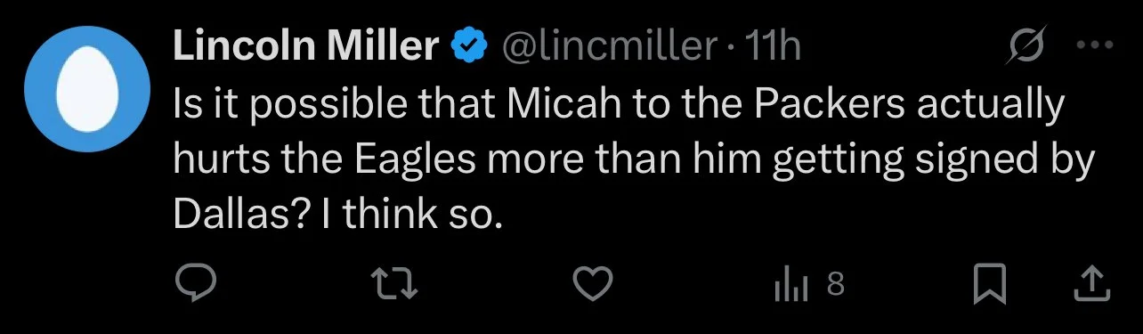 The Eagles like to bet on the culture in their building getting the most of players that may have underwhelmed elsewhere. I’ll continue to keep my eye on CB as a position where the Eagles could make a splash, but maybe that’ll happen closer to the trade deadline.