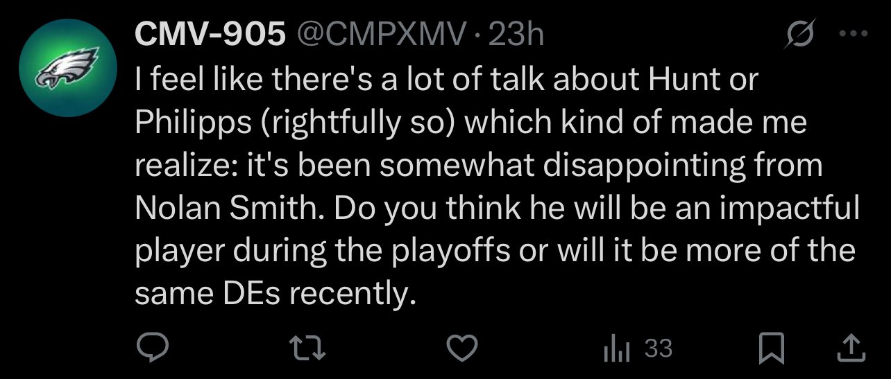 It feels like Smith does a lot of the dirty work, which sometimes ends up in other players along Philadelphia’s defensive front recording a sack or tackle for loss. According to Pro Football Focus, Smith has recorded nine total pressures and three quarterback hits in his last three games. I think the Eagles are happy with Smith’s play ahead of the postseason.