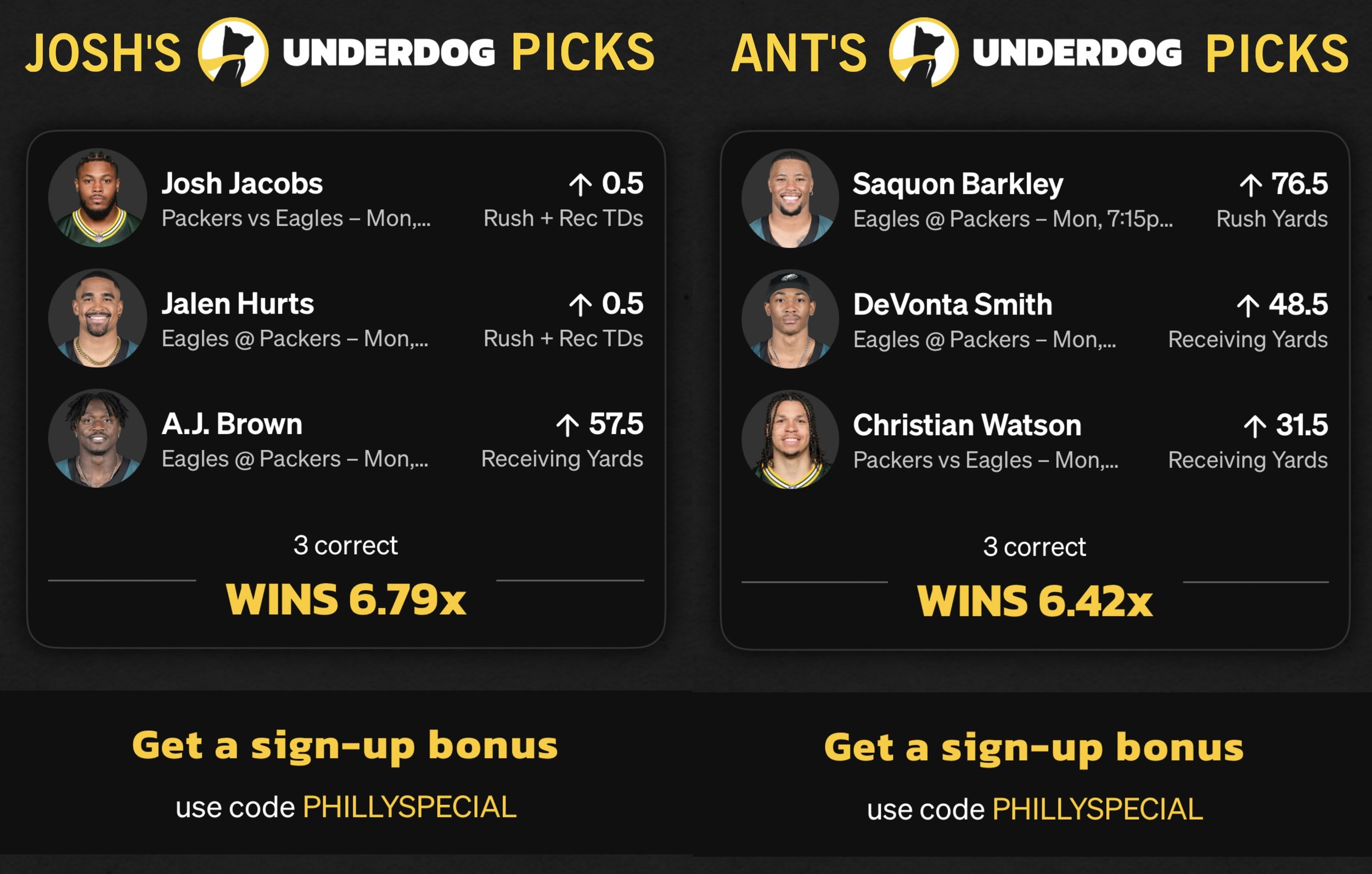 Here are our Underdog pick’em plays for the Week 10 matchup between the Eagles and Packers.