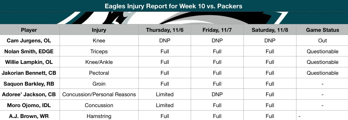 Eagles-Packers Week 10 Injury Report: Who Is Playing in Green Bay?