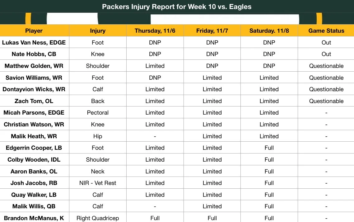 Unlike the Eagles, Green Bay’s injury report looked worse on Friday. While Savion Williams was upgraded from a DNP to a limited participant, Matthew Golden was downgraded from a limited participant to a DNP due to a shoulder injury.